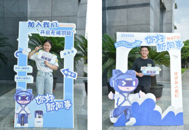7月8日,校招新員工們懷揣期待陸續(xù)抵達公司。大家首先在創(chuàng)意打卡區(qū)留下入職首照,隨后在簽名墻上留下職業(yè)生涯的第一個“印記”。他們拿起筆,寫下的不僅有自己的名字,更在筆尖流淌出對未來職業(yè)生涯的美好愿景,字里行間滿是對未來的憧憬與向往。