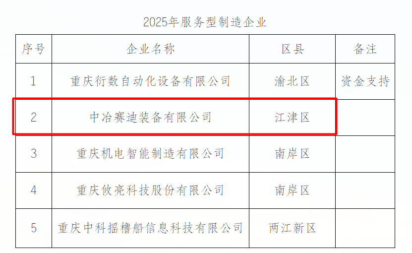 8月11日,中冶賽迪裝備申報的"綠色冶金與高端裝備服務(wù)型制造企業(yè)"通過重慶市經(jīng)濟和信息化委員會審批,成功入選重慶市2025年服務(wù)型制造企業(yè),這標(biāo)志著中冶賽迪裝備在科技創(chuàng)新、研發(fā)中試、制造型服務(wù)業(yè)建設(shè)以及引領(lǐng)行業(yè)產(chǎn)業(yè)轉(zhuǎn)型升級方面,取得階段性成果。